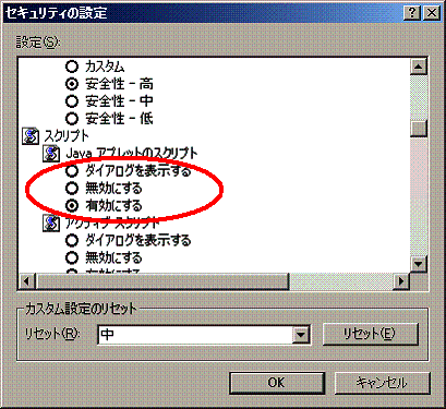スプリクトの「Javaアプレットのスプリクト」を「有効にする」